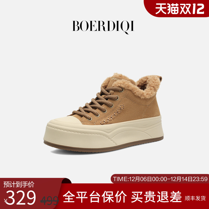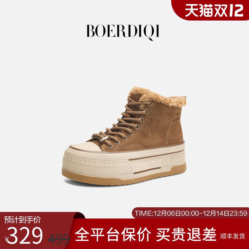 波尔谛奇羊毛加厚高帮鞋女2025冬季新款板鞋加绒保暖厚底休闲鞋子