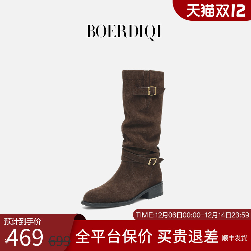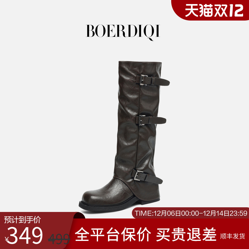 波尔谛奇手抓纹褶皱堆堆靴女2025秋季新款小众设计皮带扣时装长靴
