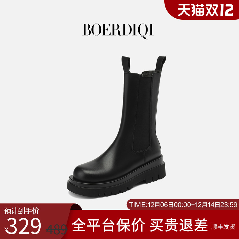 波尔谛奇黑色粗跟羊皮时装靴女2025秋冬新款加绒保暖百搭增高短靴
