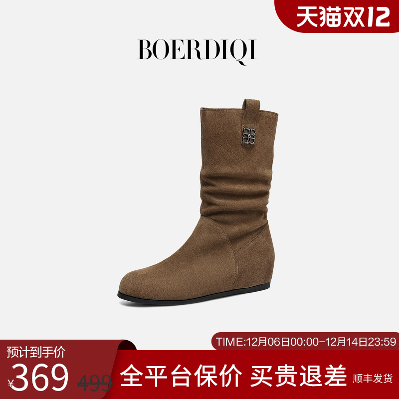 波尔谛奇绒面中筒瘦瘦靴女百搭内增高加绒秋冬款保暖休闲靴时装靴