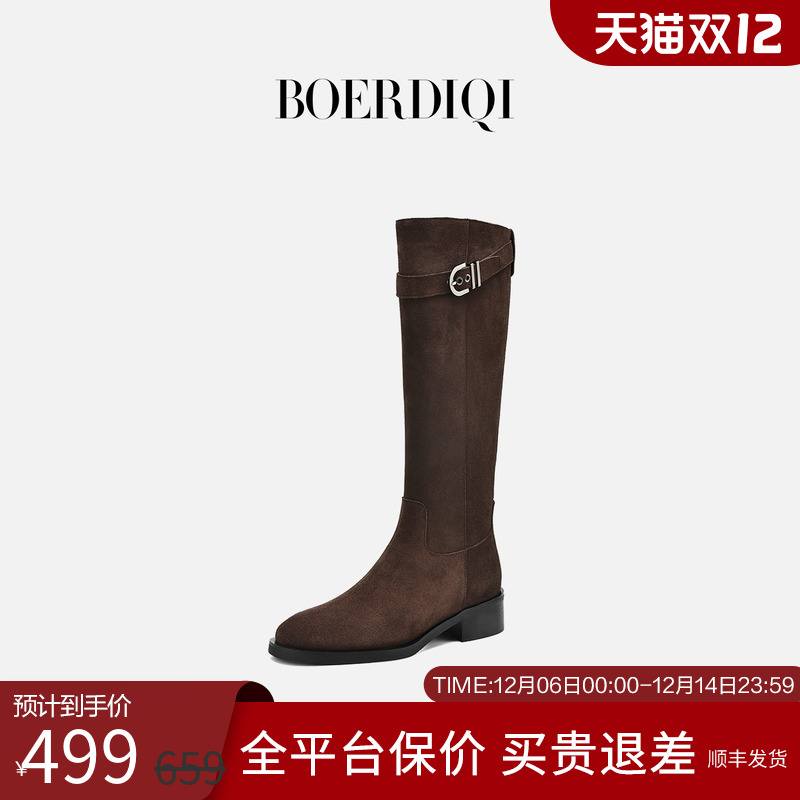 波尔谛奇加绒保暖高筒骑士靴秋冬款显瘦圆头粗跟时装靴时尚长靴女