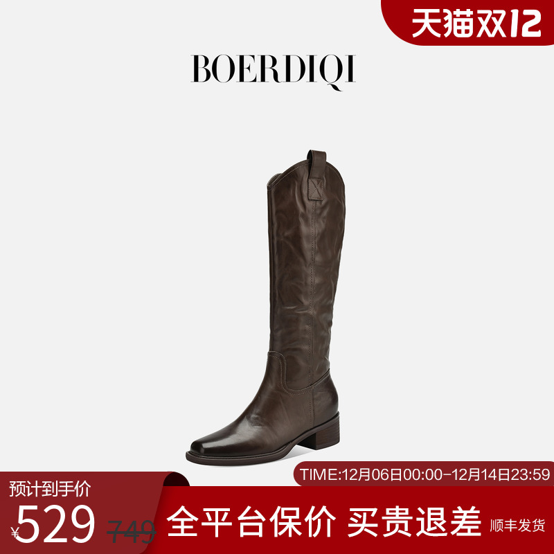 波尔谛奇手抓纹牛皮复古西部靴秋冬粗跟高筒长靴圆头休闲加绒女靴