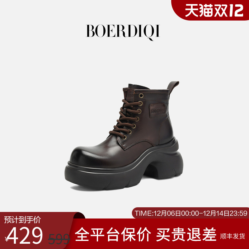 波尔谛奇加绒保暖系带马丁靴女2025秋冬新款头层牛皮厚底增高短靴