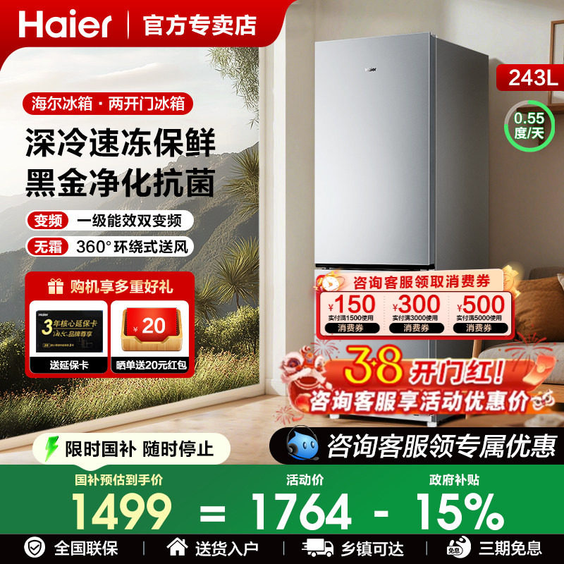 海尔电冰箱以旧换新补贴251L三门一级能效家用小型无霜出租房二人