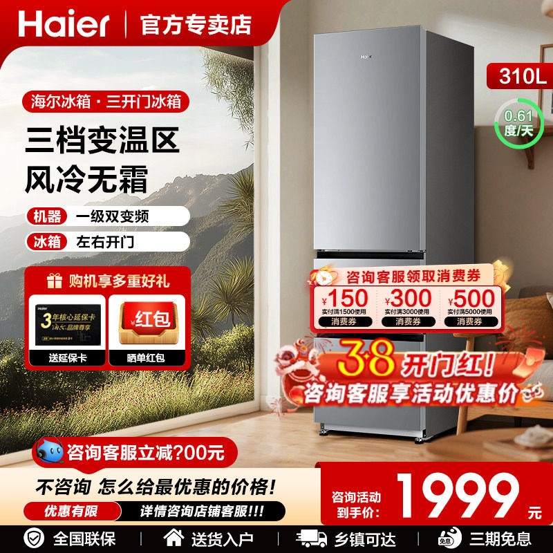 海尔电冰箱以旧换新补贴310L三门无霜一级能效家用小型出租房官方