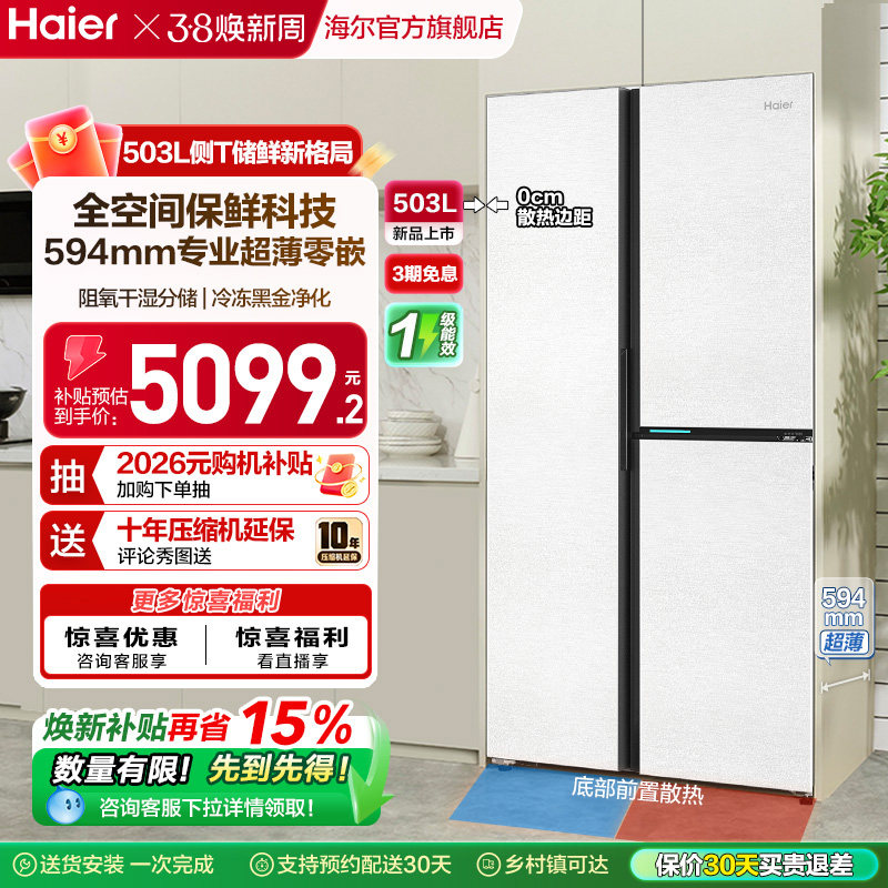 换新补贴海尔503L双开三门风冷无霜超薄零嵌家用一级能效冰箱官方