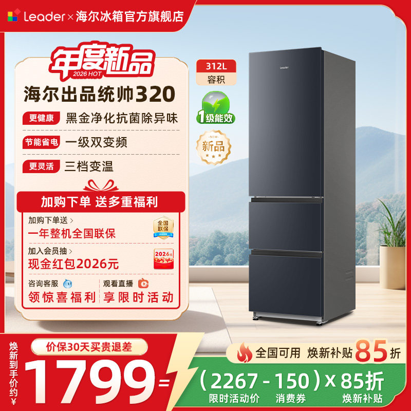 换新补贴海尔出品统帅320三门小冰箱节能租房宿舍家用冰箱官方