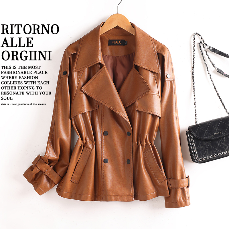 海宁真皮皮衣女士短款韩版系带收腰皮风衣宽松显瘦皮夹克休闲外套