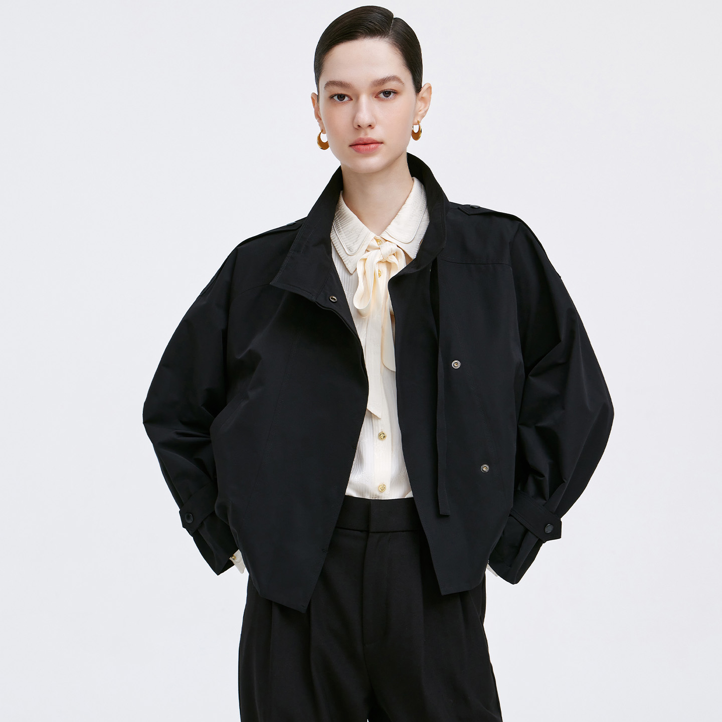 风衣女黑色2025新款短款外套宽松春秋女士休闲大衣百搭收腰立领