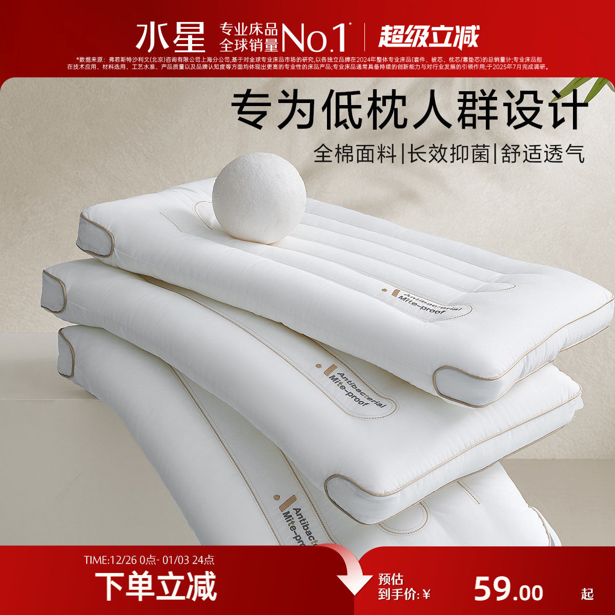 水星家纺枕头枕芯全棉抗菌防螨单人呵护颈椎软枕枕头芯低枕可水洗
