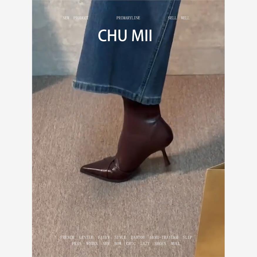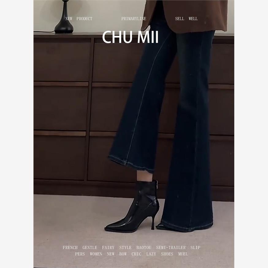misili 性感尖头细跟短靴女 2024秋冬季新款高跟鞋黑色厚底女靴子