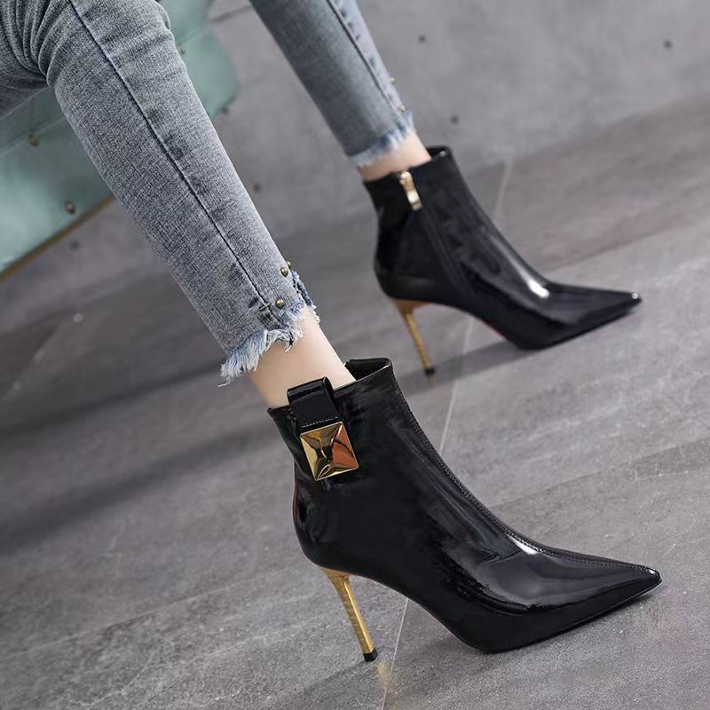 性感尖头细跟显瘦气质短靴女2025年秋冬新款漆皮高跟后拉链瘦瘦靴