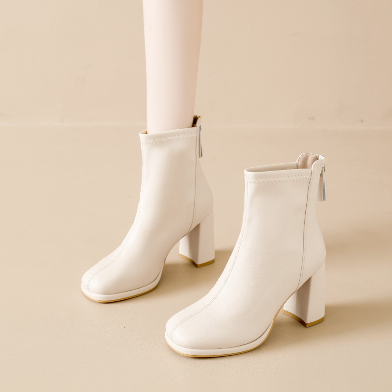 粗跟短靴女2025秋冬新款法式气质白色小个子高跟及踝靴瘦瘦时装靴