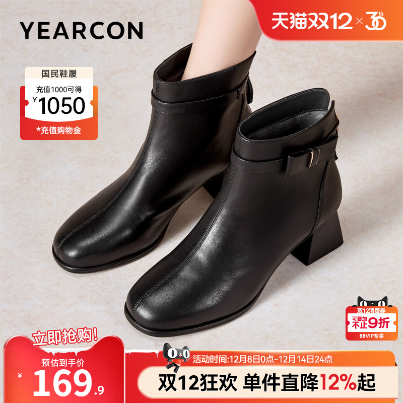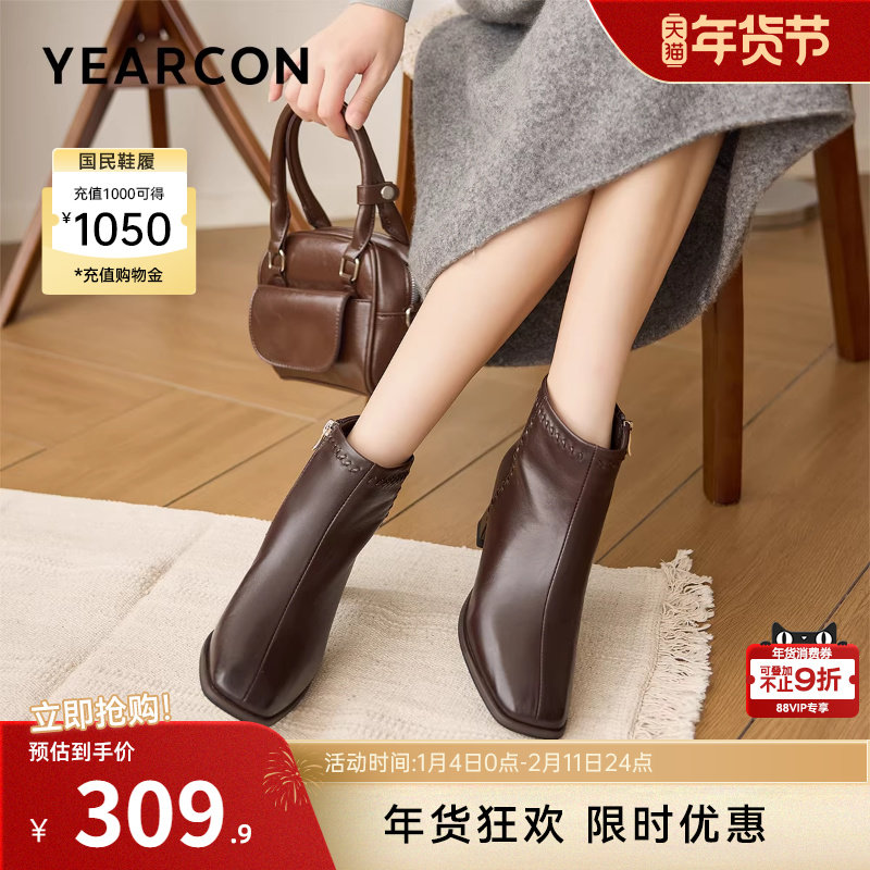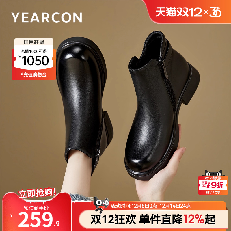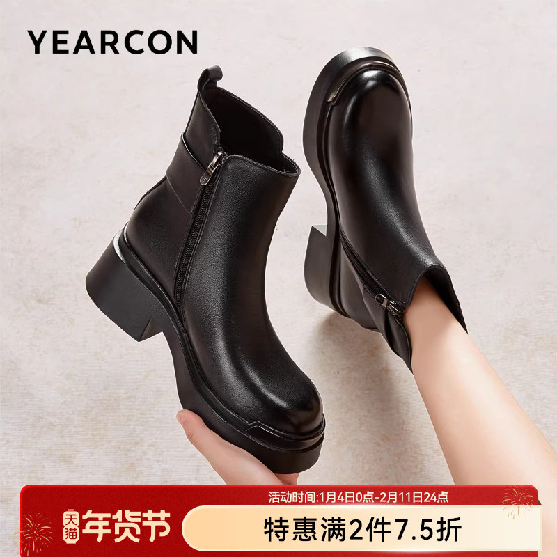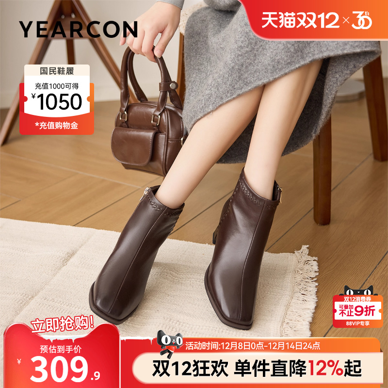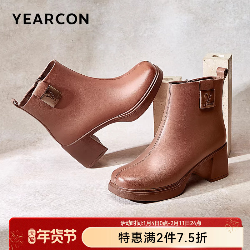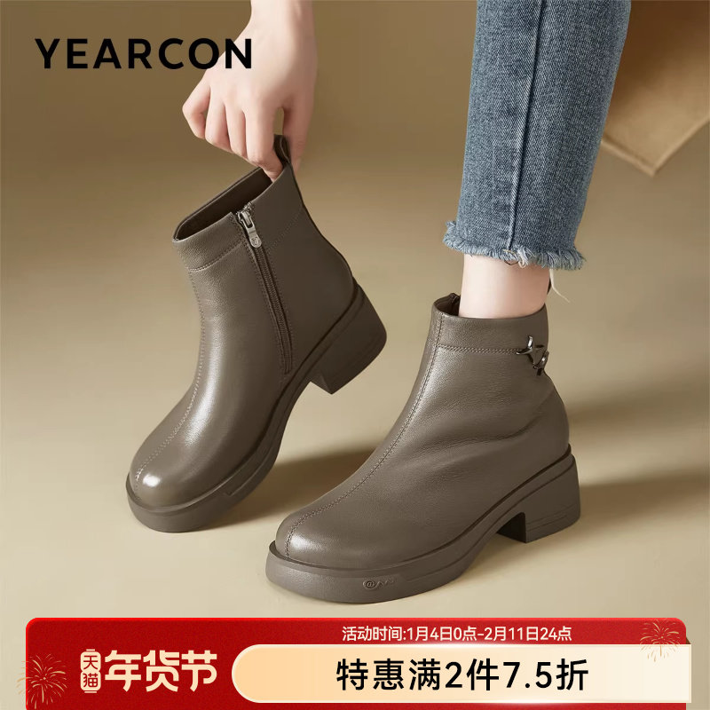 意尔康女鞋2025冬季真皮法式短靴粗跟气质显瘦配裙子单靴及踝靴女