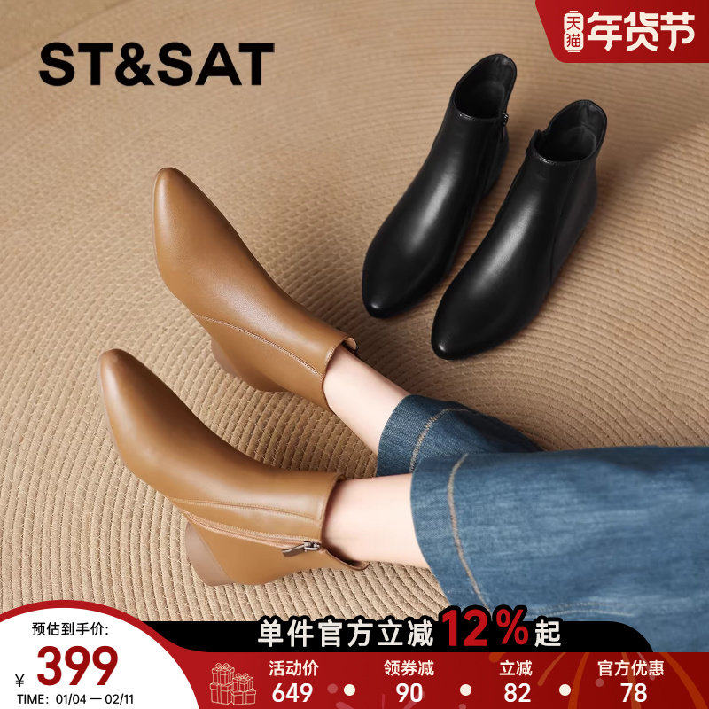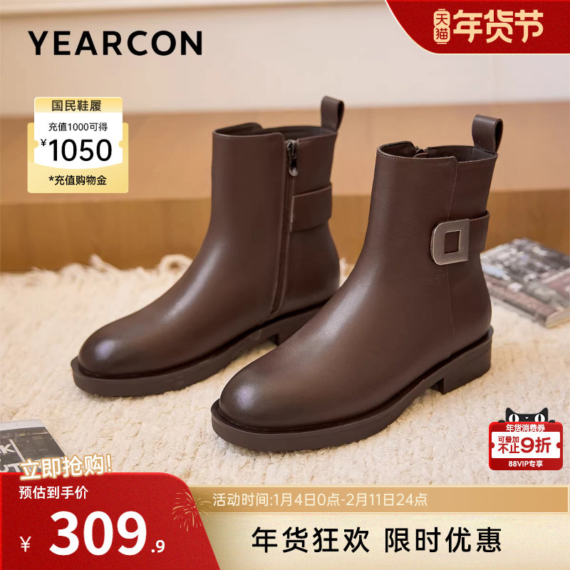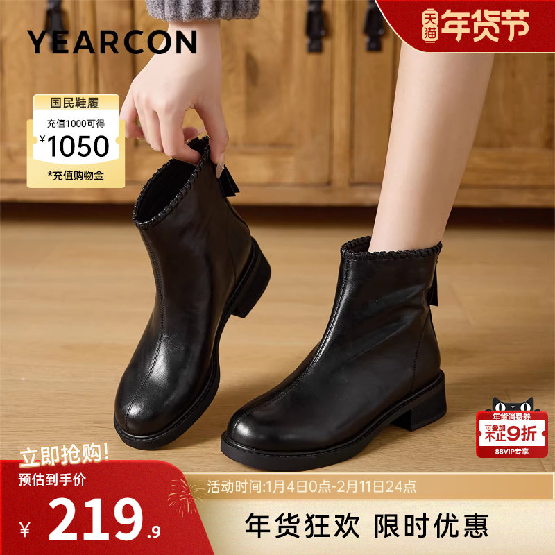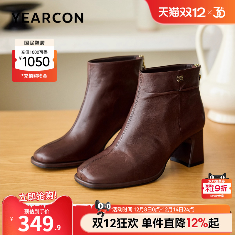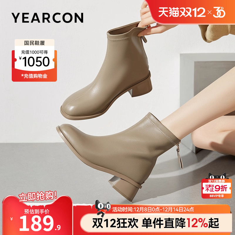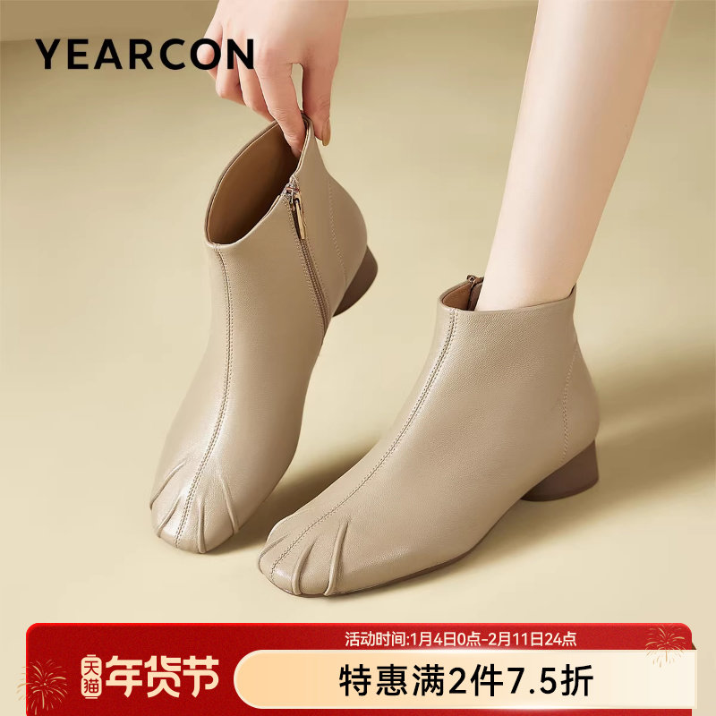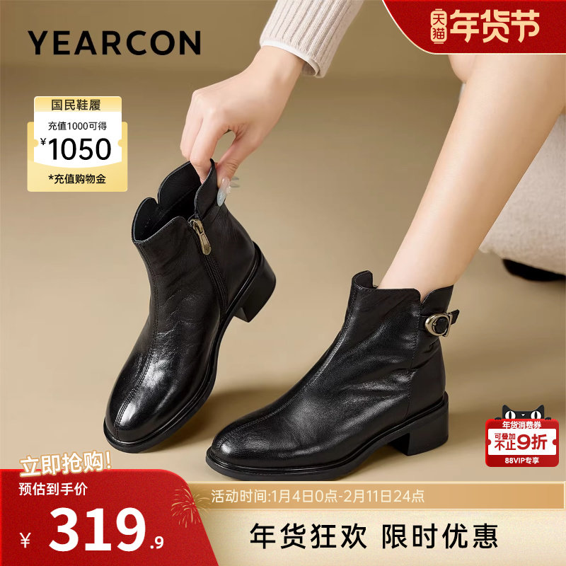 意尔康女鞋2025冬季真皮法式短靴粗跟气质显瘦配裙子单靴及踝靴女