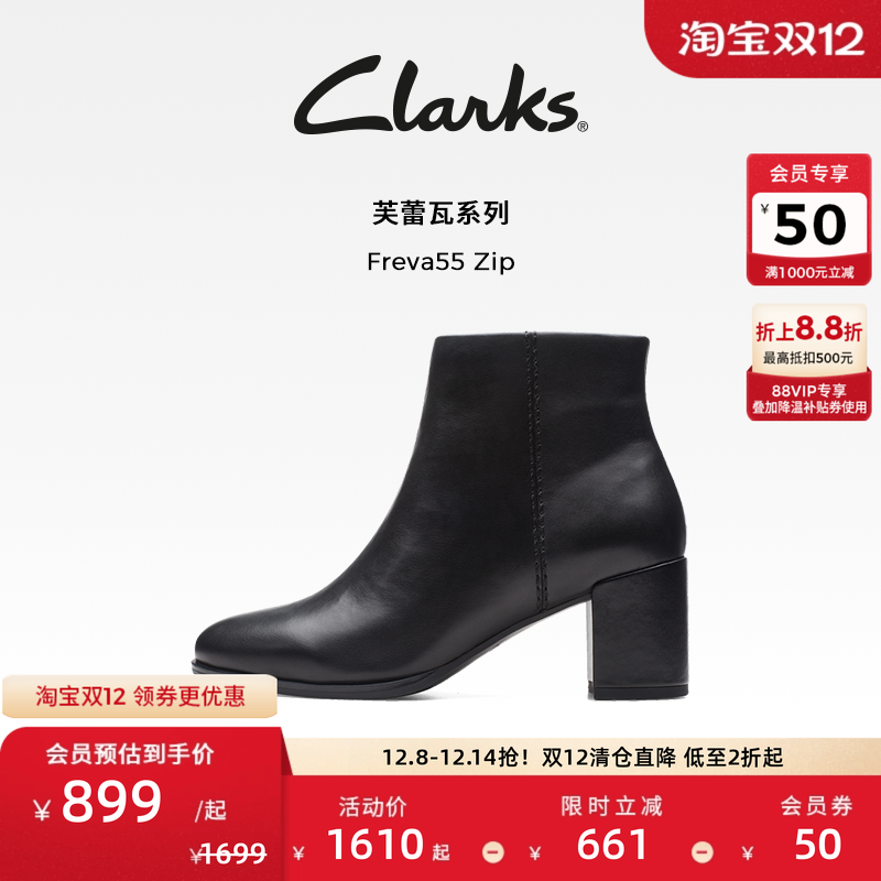 Clarks其乐Freva55 Zip女鞋秋冬粗跟拉链及踝靴牛皮高跟短靴