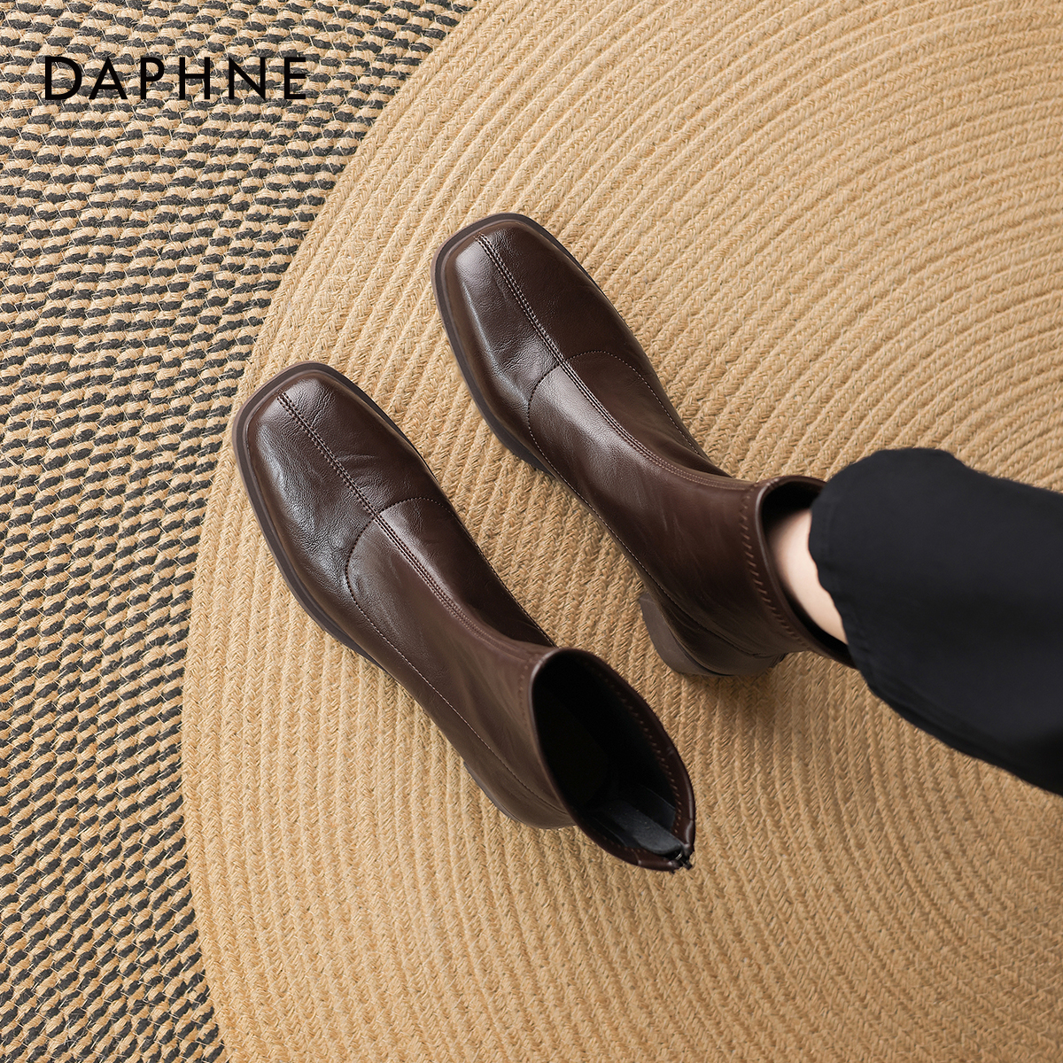 达芙妮棕色短靴女2025新款秋冬粗跟马丁靴方头及踝靴子复古瘦瘦靴