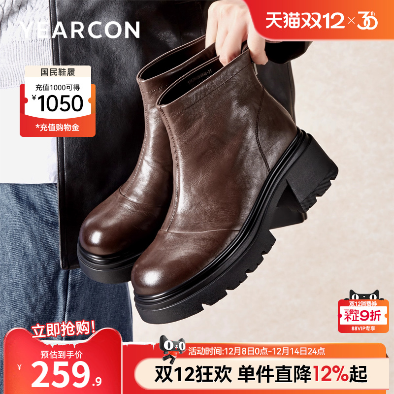 意尔康女鞋秋冬真皮短靴粗跟单靴气质英伦显瘦复古及踝靴女士皮鞋