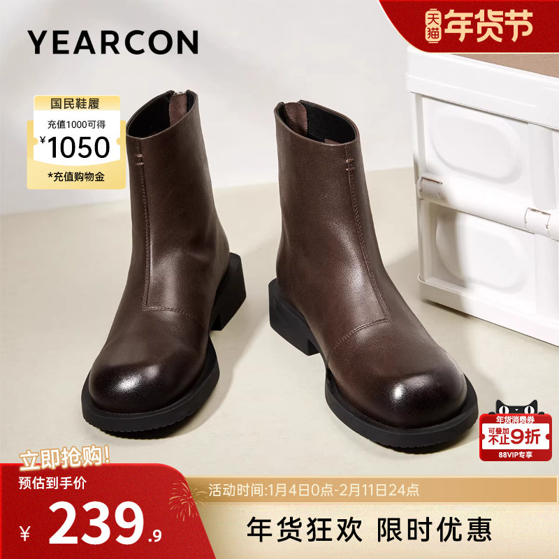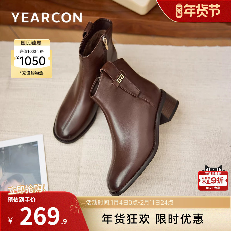 意尔康女鞋2025冬季真皮复古法式加绒短靴粗跟气质及踝靴女士皮鞋