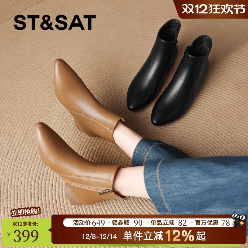 星期六深口单鞋女尖头高跟鞋2025新款秋冬羊皮女鞋及踝靴粗跟皮鞋