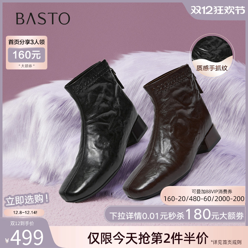 百思图2025冬季商场新款气质法式及踝靴羊皮靴粗跟女短靴BN889DD5