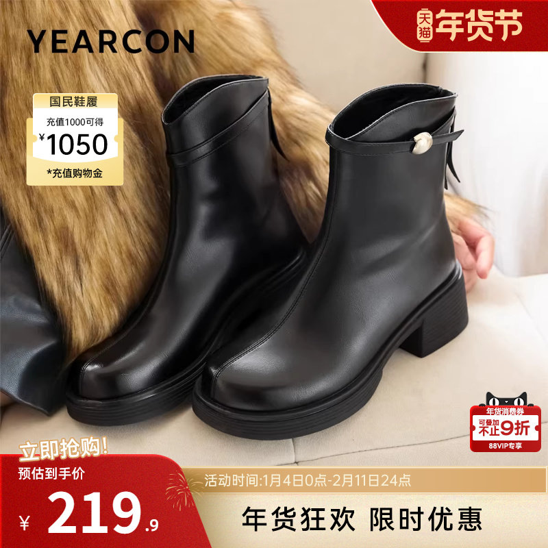 意尔康女鞋2025冬季法式短靴女粗跟气质英伦风加绒女靴舒适及踝靴
