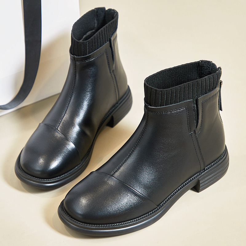 皮厚先生 中跟黑色女靴及踝靴女 秋季粗跟短靴女时尚真皮切尔西靴