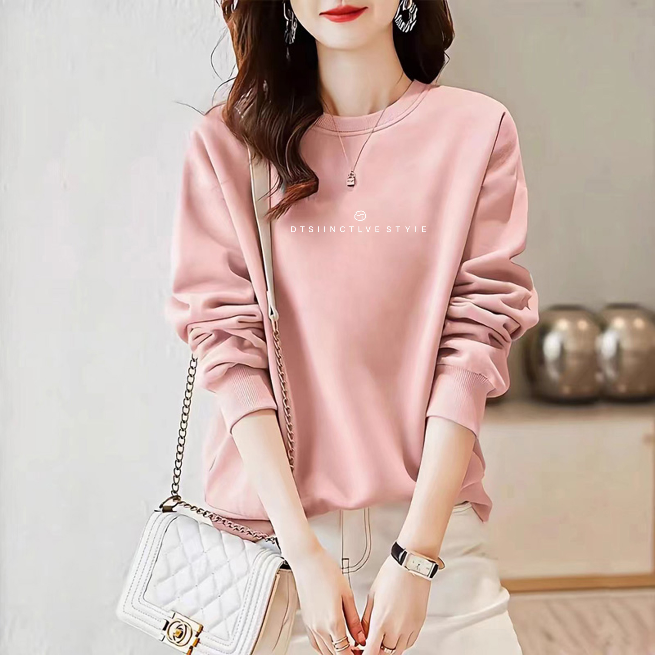 宽松显瘦圆领卫衣女2024年秋冬新品韩版长袖套头粉色上衣加绒加厚