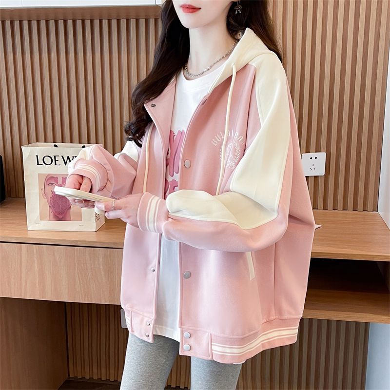 小个子粉色棒球服外套女秋冬季2025新款宽松大码加绒加厚连帽卫衣