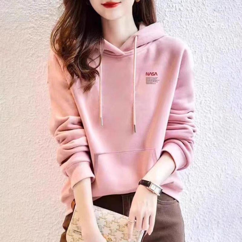 韩系慵懒风连帽粉色卫衣外套女秋冬加绒加厚宽松休闲小众设计上衣