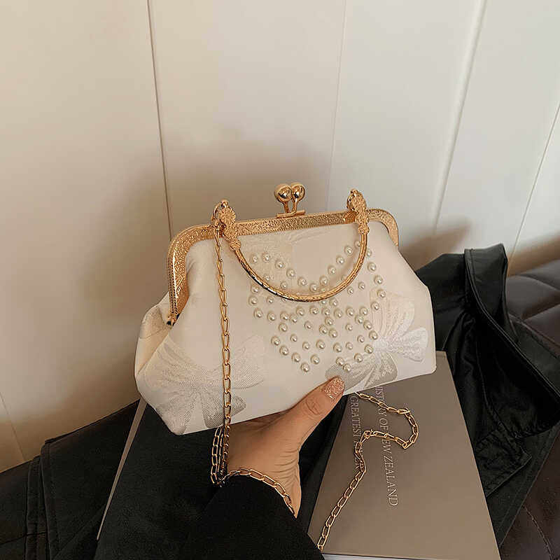 中式国风珍珠包包手提夹口小包2024新款时尚链条单肩贝壳斜挎包
