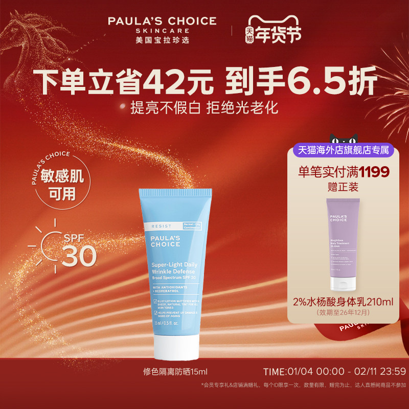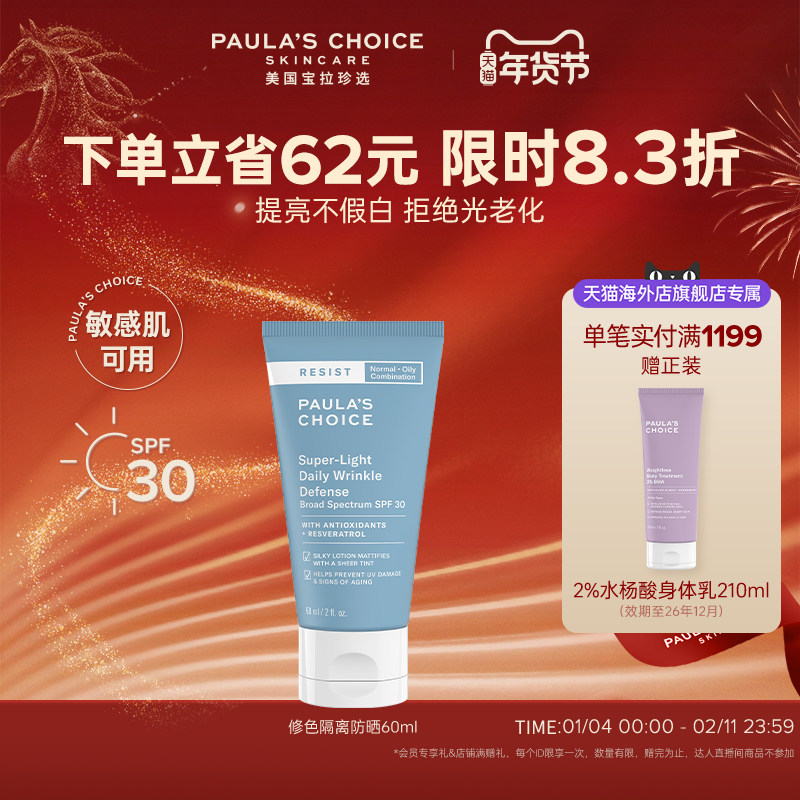 纯物理丨宝拉珍选清透修色隔离乳SPF30 60ml 控油防晒霜润色