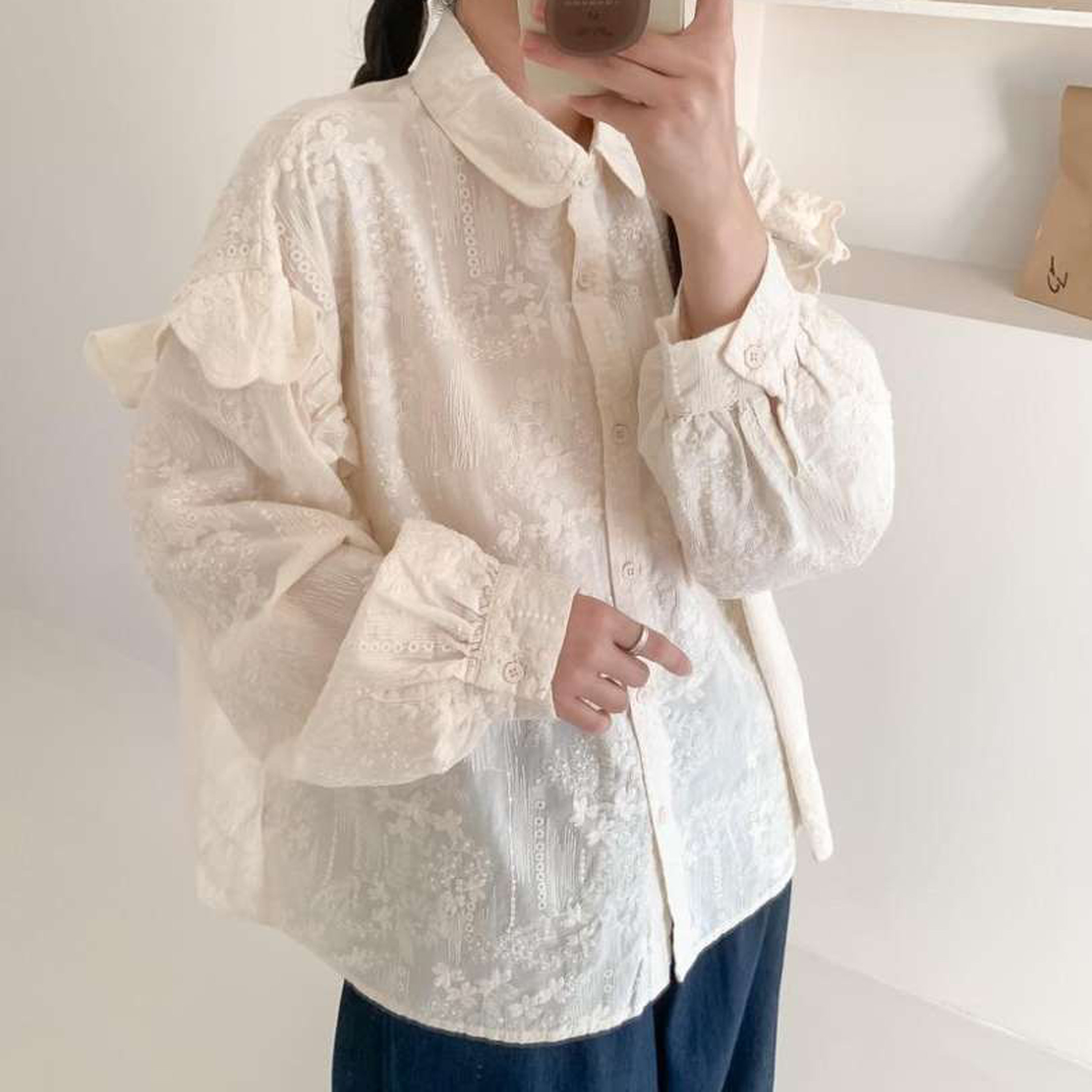 2026春秋肩膀特色花边长袖衬衫女韩范时尚提花衬衣重工刺绣蕾丝衫