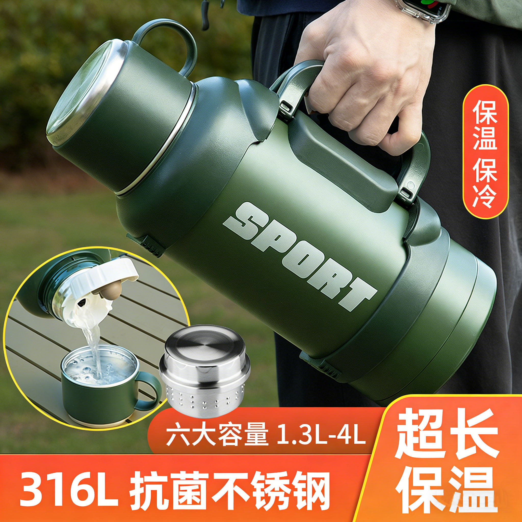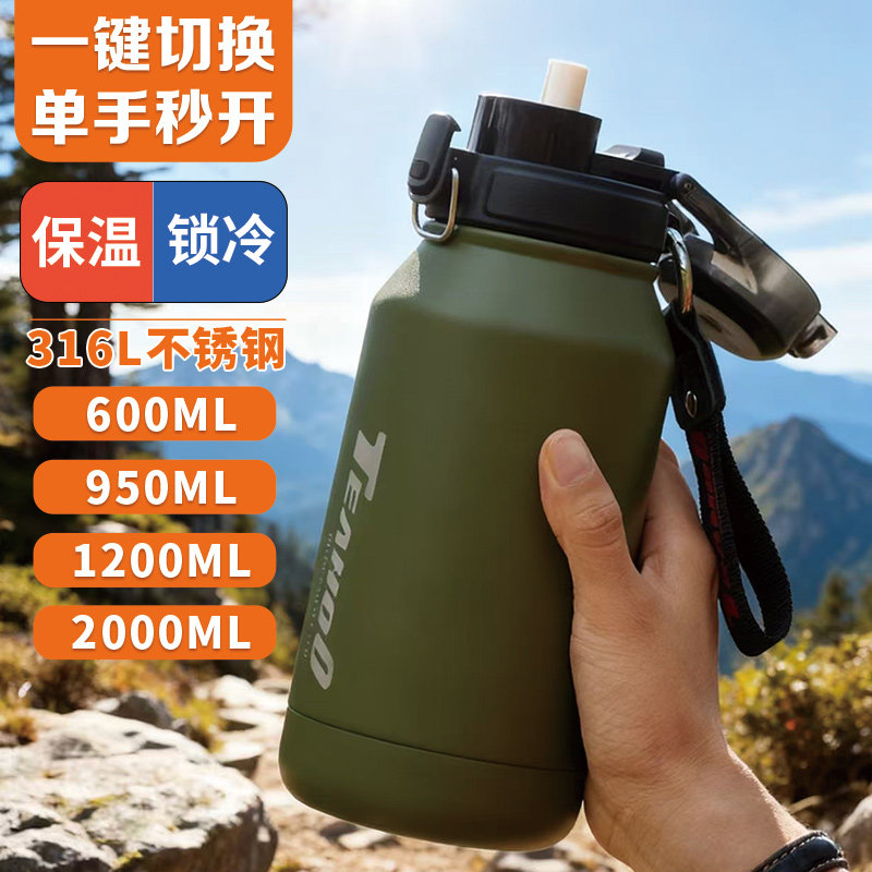 琪虎316L不锈钢背式保温保冷杯全钢手提斜挎户外轻便杯子大号水壶