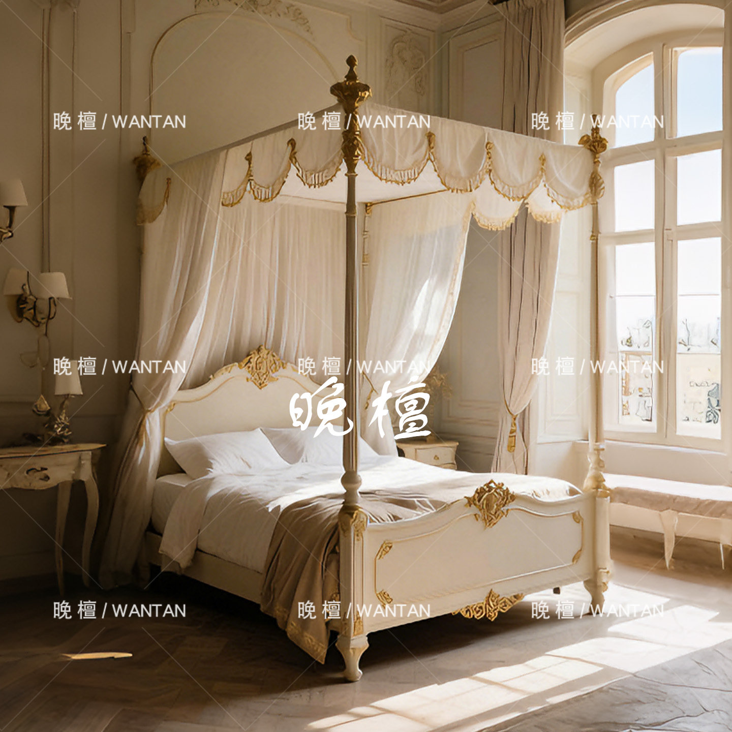 晚檀 法式复古四柱床 实木床 别墅公主床 金色雕花装饰白色双人床