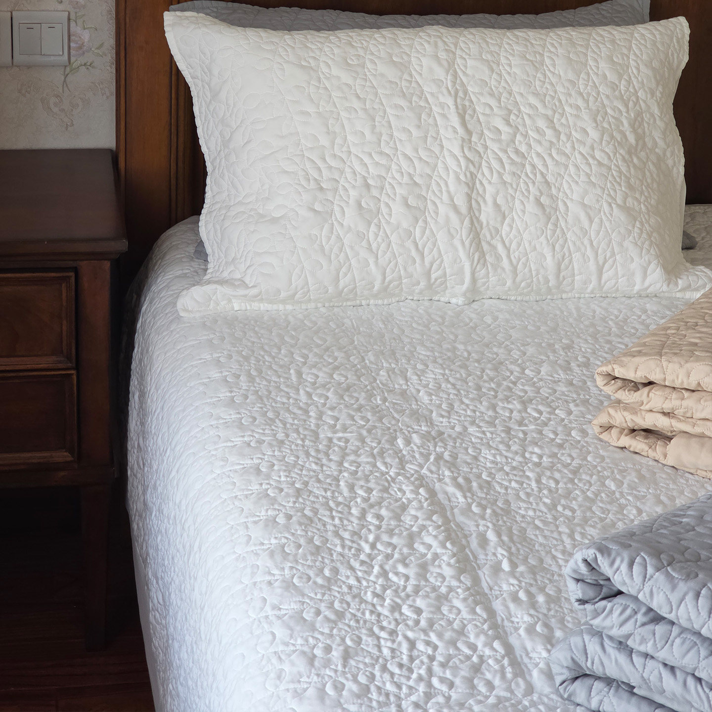 纯白色叶子双面绣花绗缝被三件套夹棉床盖双人床单床罩夏凉空调被