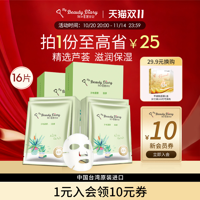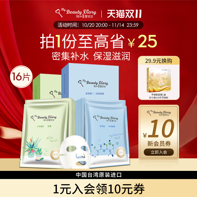 我的美丽日记台湾省玻尿酸沙地芦荟面膜16片组补水润深层保湿官方
