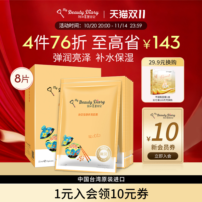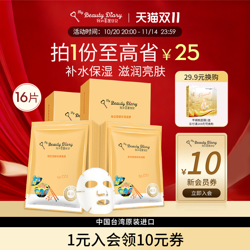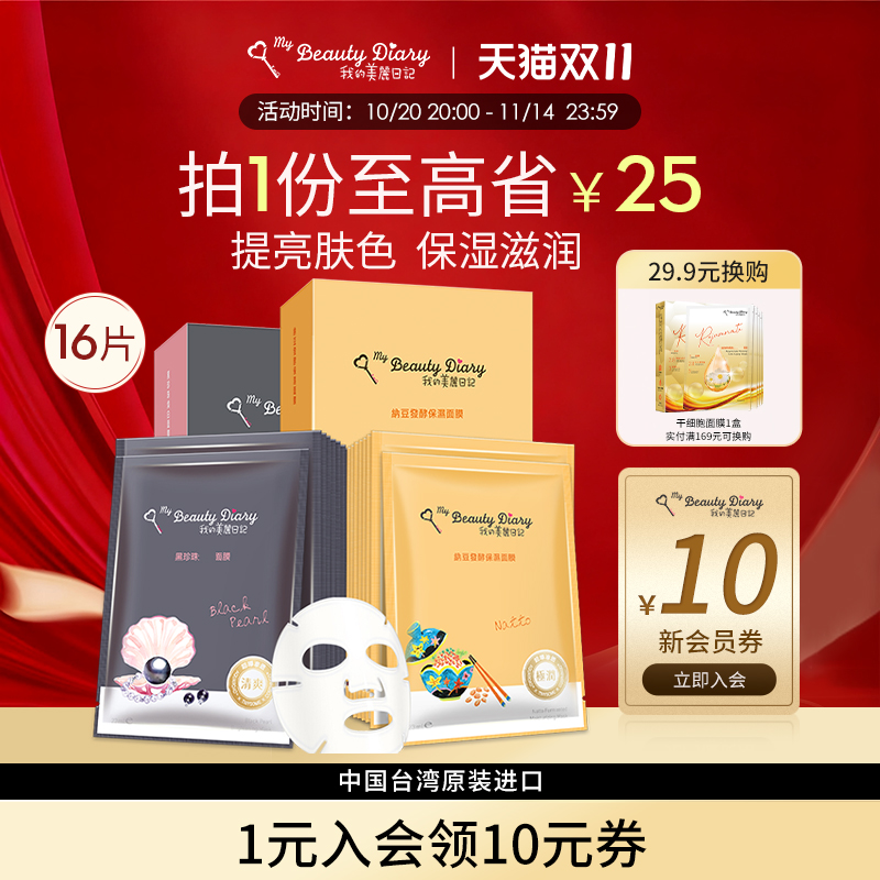 我的美丽日记面膜纳豆黑珍珠16片组提亮肤色补水清爽保湿官方正品