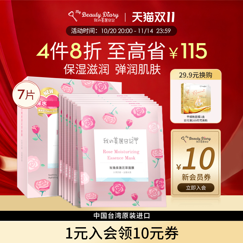 我的美丽日记大马士革玫瑰花瓣面膜8片保湿水润提亮清爽官方正品