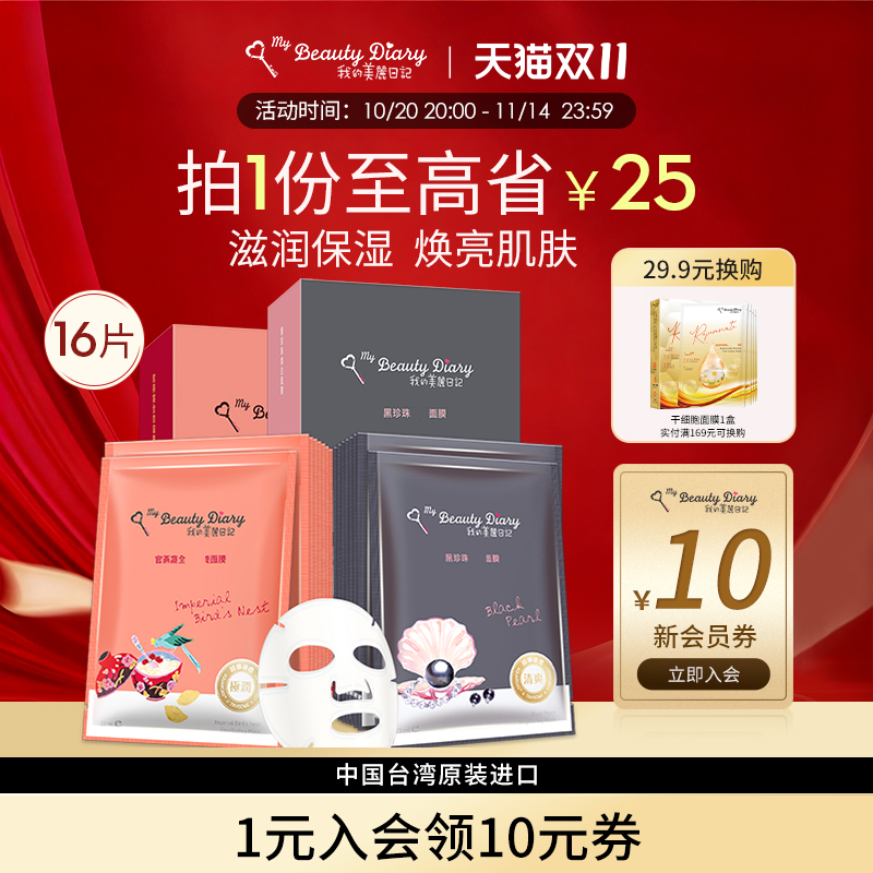我的美丽日记面膜海外黑珍珠官燕窝16片组提亮清爽补水润官方正品