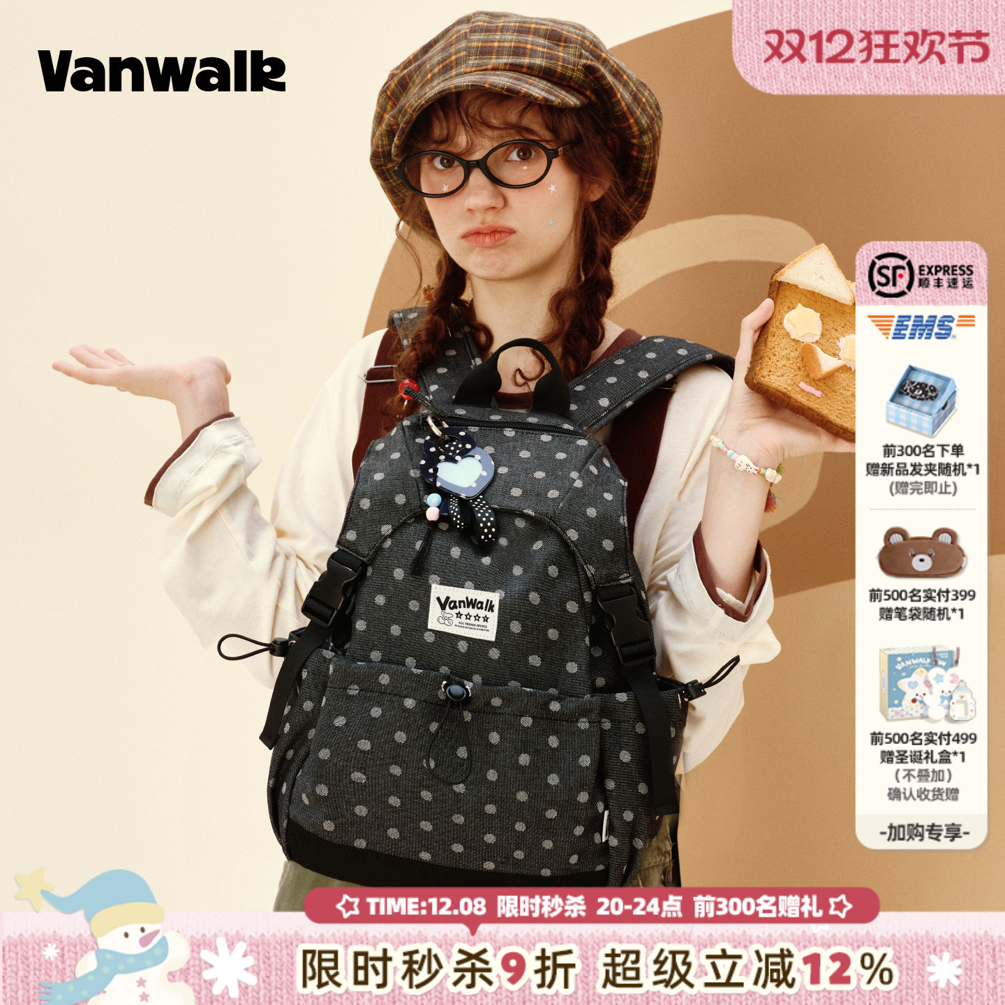 VANWALK松果部落 新款小众星星豹纹休闲双肩包女外出通勤黑色书包