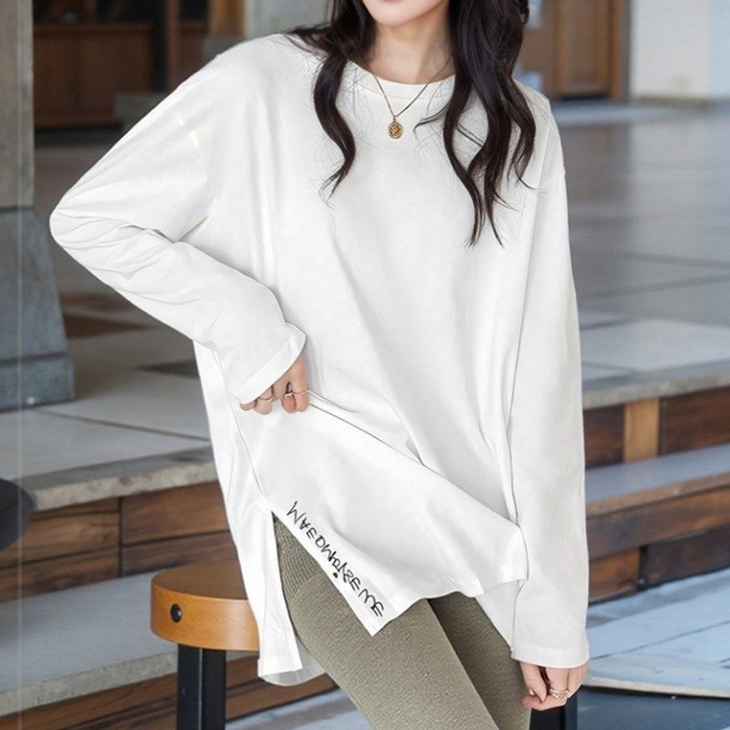 打底衫女秋冬内搭可外穿中长款宽松遮肚子微胖妹妹圆领白色t恤女