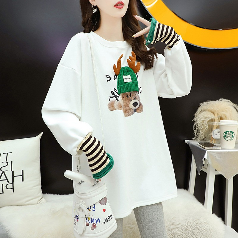 卡通圆领中长款德绒长袖T恤女2022春秋新款韩版宽松胖妹妹打底衫