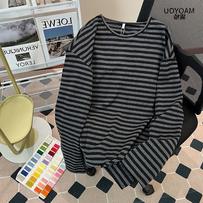 秋冬大码女装胖妹妹遮肚坑条长袖t恤裙中长款显瘦胖MM百搭打底衫
