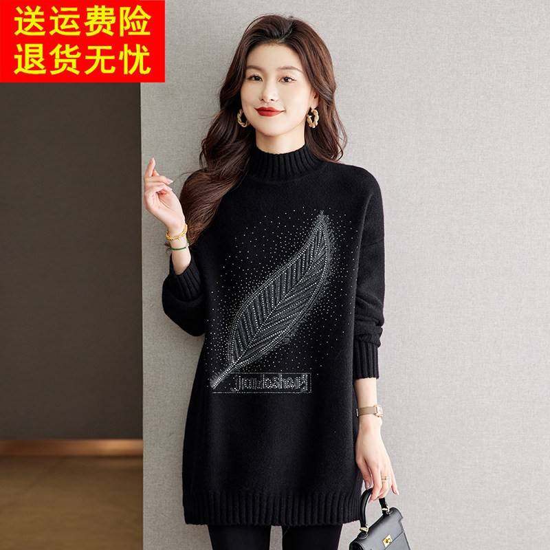 半高领毛衣女中长款打底衫毛衣裙大码女装镶钻羊毛衫200斤胖妹妹