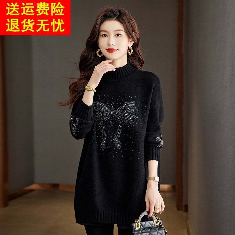 镶钻毛衣女中长款打底衫毛衣裙宽松大码女装200斤胖妹妹羊毛衫厚