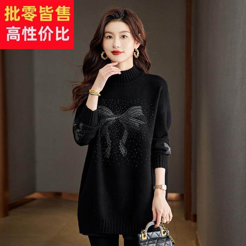 鸡心领毛衣女中长款打底衫毛衣裙镶钻羊毛衫宽松大码女装胖妹妹厚