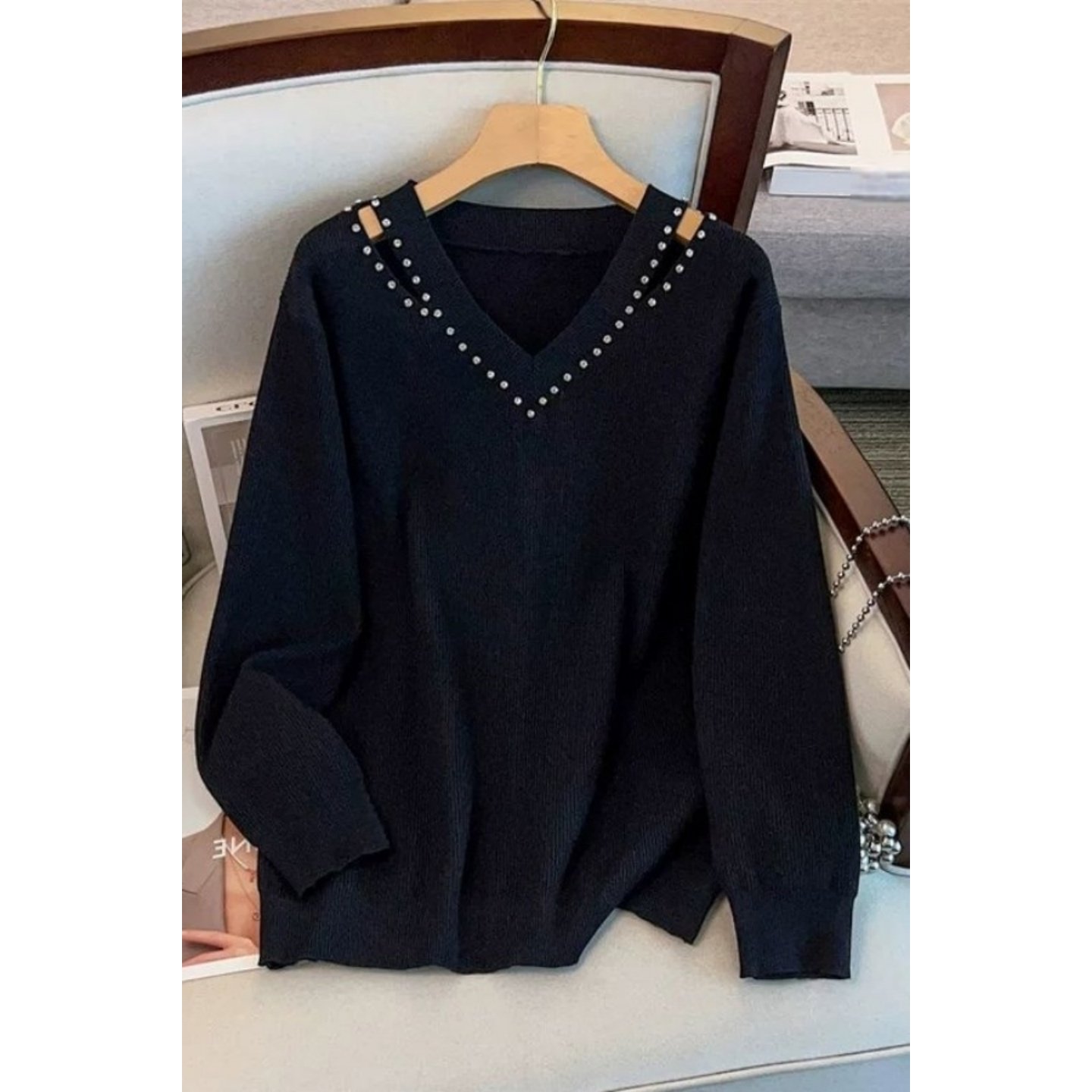 胖妹妹中长款钉珠V领打底毛衣女300斤大码复古宽松休闲显瘦针织衫