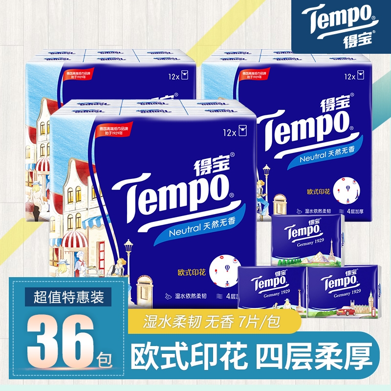 Tempo得宝手帕纸4层36包欧式印花纸巾小包随身装便携餐巾纸面巾纸