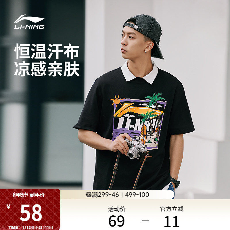 李宁短袖男士夏季官方男装半袖圆领体恤休闲宽松上衣印花运动T恤